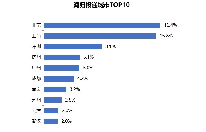 具体来看,海归投递前十的城市吸纳了64.2%的海归就业需求,而其中排名前二的北京、上海两城则合计占超3成,深圳占8%。新一线城市杭州对海归的吸引力与广州不相上下,均在5%左右。成都、南京、苏州、天津、武汉等新一线城市依靠较强的发展潜力与引才政策,也促使海归人才积极奔赴。