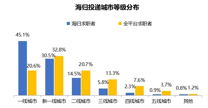具体来看,一线城市为海归回巢大本营,吸纳了45.1%的求职申请,全平台求职者中只有20.6%做出相同选择。而全平台求职者期望就业热度最高的新一线城市是海归第二大回流地,占比均在3成。海归对于二到五线及其他级别城市的发展意愿也均低于整体求职者。